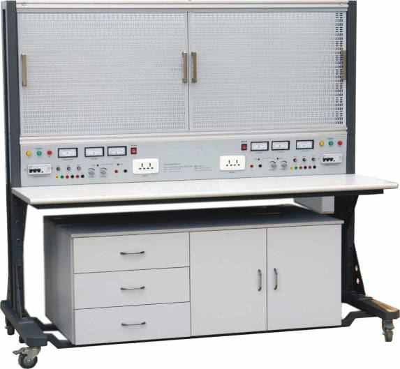 本實訓(xùn)臺由實訓(xùn)屏(內(nèi)置電源)、實訓(xùn)桌、實訓(xùn)儲物柜三大部分組成。以30mm×30mm成型方鋼作為設(shè)備主要框架材料;實訓(xùn)屏、地盤采用焊接連接、關(guān)鍵部位采用三角筋用內(nèi)六角螺釘加固連接,表面經(jīng)高溫噴塑處理,美觀大方且有效起到防銹絕緣的作用;由兩條35mm×35mm鋁合金型材及滑槽組成網(wǎng)孔板固定機(jī)構(gòu);固定機(jī)構(gòu)的下方是鐵制雙工位電源箱,每工位電源箱的布局依次為電源保護(hù)裝置、電源指示裝置、電源輸出;實訓(xùn)桌桌面采用25mm麻灰色高密度層壓板封邊特制,有效提高絕緣等級;實驗桌底部裝有至少4個導(dǎo)向輪,方便實訓(xùn)臺架移動;