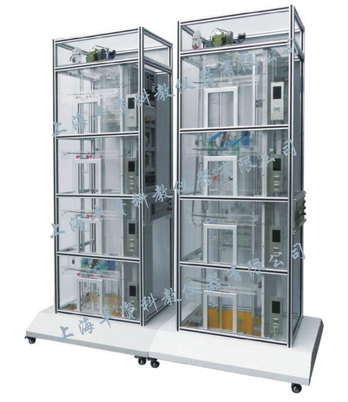 1、由兩臺四層透明仿真教學(xué)客梯組成,由層外兩處按鈕共同控制。