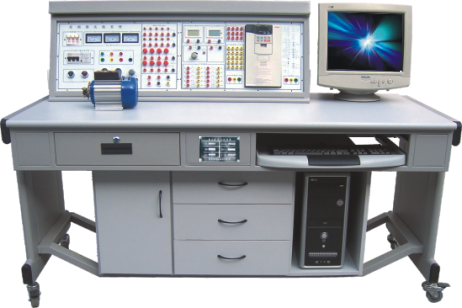 實訓裝置由控制屏、實訓桌、變頻實訓組件、繼電接觸實訓組件、數字量/模擬量輸入輸出給定指示組件、三相異步電機、電機導軌、測速機構等組成。