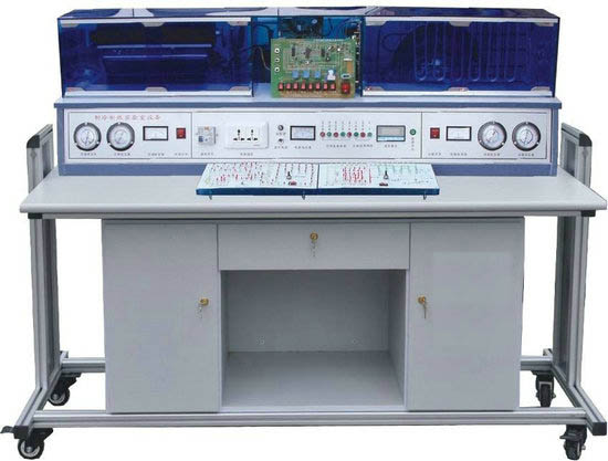 變頻空調(diào)制冷制熱綜合實驗設(shè)備采用了變頻技術(shù),先將單相交流電源經(jīng)整流橋整流成 直流電,又經(jīng)三相逆變橋把直流電“逆變”成頻率任意可調(diào)的三相交流電,自動控制 壓縮機的速度,達到節(jié)能的目的。另外新增加其它類型的空調(diào)、冰箱系統(tǒng)及電路十幾 個機種,有利于學(xué)生更全面地掌握制冷制熱技術(shù)。分體空調(diào)為立體結(jié)構(gòu),前面為仿真 室內(nèi)機組,后部為仿真室外機組,室內(nèi)機組改進為真實空調(diào)組件,外套真空調(diào)全透明 外殼。冰箱方面也進行了改進,前后格分開:前面為冷凍室,后面為電冰箱壓縮機、 工作室、加裝溫度調(diào)節(jié)器。