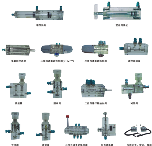 壓力表,油箱,溢流閥,節(jié)流閥,單向閥,液控單向閥,調(diào)速閥,順序閥,減壓閥,雙作用油缸,彈簧作用油缸,增壓油缸,二位四通電磁換向閥,二位二通電磁換向閥,“O”型三位四通電磁換向閥,“H”型三位四通電磁換向閥,“M”型三位四通電磁換向閥,“Y”型三位四通電磁換向閥,“P”型三位四通電磁換向閥,壓力繼電器,行程開關(guān)等。