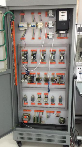 該裝置按標準電氣控制柜設計制造規(guī)格,充分利用雙面位置,柜內裝有完成各種照明電路所需的單相電度表、日光燈、單聯開關、插座、感應開關、漏電開關等,以及電氣控制所需要的多種低壓電器,如漏電斷路器、熔斷器、電流互感器、交流接觸器、時間繼電器、熱繼電器、中間繼電器、行程開關、按鈕、信號燈、轉換開關、電壓表、電流表、功率表及電度表等,為了延長電器使用壽命,各電器的接點都與接線端子相連,再由接線端子與被控制電氣連接。