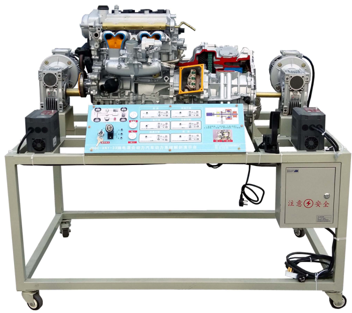 該設(shè)備采用翻新豐田普銳斯混聯(lián)式混合動(dòng)力系統(tǒng)(包括:發(fā)動(dòng)機(jī)、發(fā)電機(jī)和電動(dòng)機(jī)等)總成進(jìn)行剖面處理,各部件齊全,剖面位置合理,能全面展示混聯(lián)式混合動(dòng)力系統(tǒng)內(nèi)外部結(jié)構(gòu)和部件的運(yùn)動(dòng)情況。適用于混合動(dòng)力汽車動(dòng)力系統(tǒng)原理和機(jī)械機(jī)構(gòu)的教學(xué)。