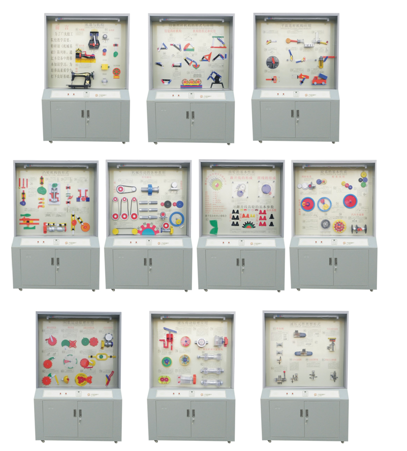 根據(jù)全國(guó)技工學(xué)校機(jī)械類通用教材《機(jī)械基礎(chǔ)》示教陳列柜是一套電化教學(xué)設(shè)備。本陳列柜共分十個(gè)柜,陳列柜通過機(jī)械模型或?qū)嵨?,配合相?yīng)的圖文資料,形象地展示與解說機(jī)械基礎(chǔ)的基本知識(shí),加強(qiáng)學(xué)生對(duì)通用機(jī)械基礎(chǔ)的類型、結(jié)構(gòu)特點(diǎn)及其設(shè)計(jì)的感性認(rèn)知,為進(jìn)一步學(xué)習(xí)機(jī)械基礎(chǔ)奠定基礎(chǔ)。