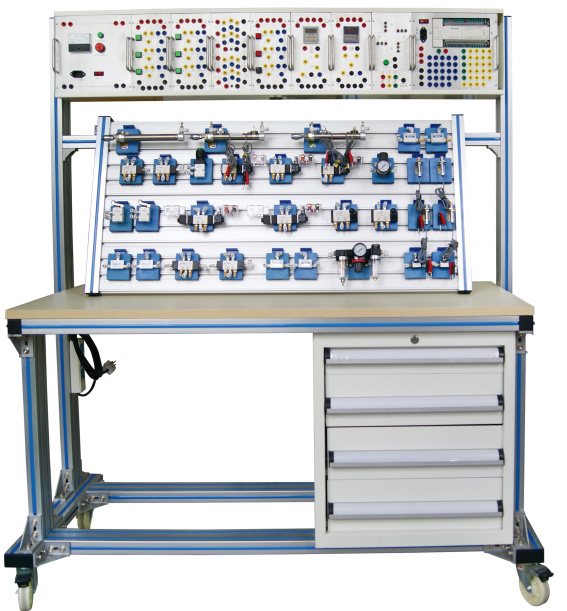 實驗臺由實驗臺架、工作泵站、常用氣動元件、電氣控制單元等幾部分組成。