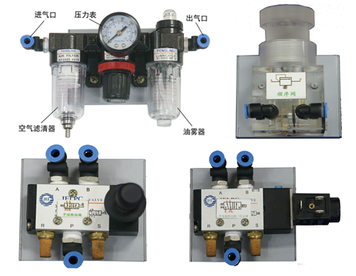 空氣過濾、減壓、油霧器三聯(lián)件,減壓閥,手動(dòng)換向閥,電磁換向閥,氣控?fù)Q向閥,行程閥,單向閥,節(jié)流閥、單向節(jié)流閥、快速排氣閥,或門 型梭閥,單作用氣缸,雙作用氣缸、旋轉(zhuǎn)氣缸,行程開關(guān)(常閉、常開)等。